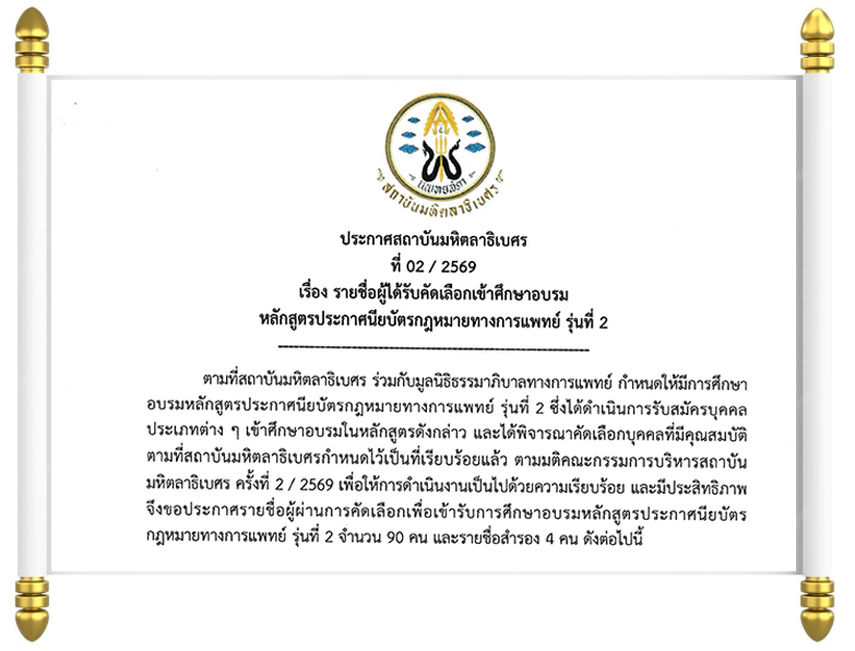ประกาศรายชื่อผู้ได้รับคัดเลือกเข้าศึกษาอบรมหลักสูตรประกาศนียบัตรกฎหมายการแพทย์ รุ่นที่ 1 (ปกพ.1)