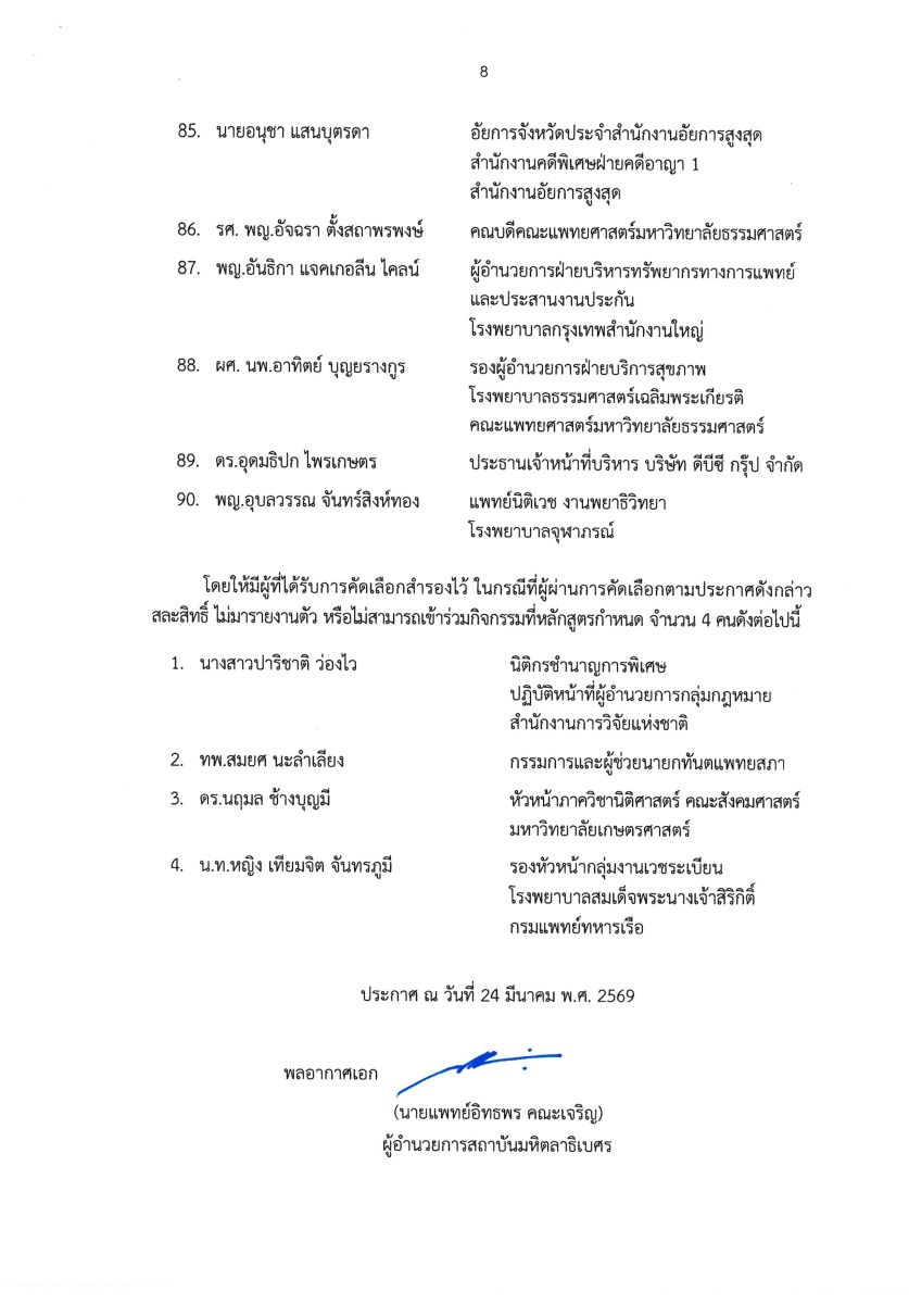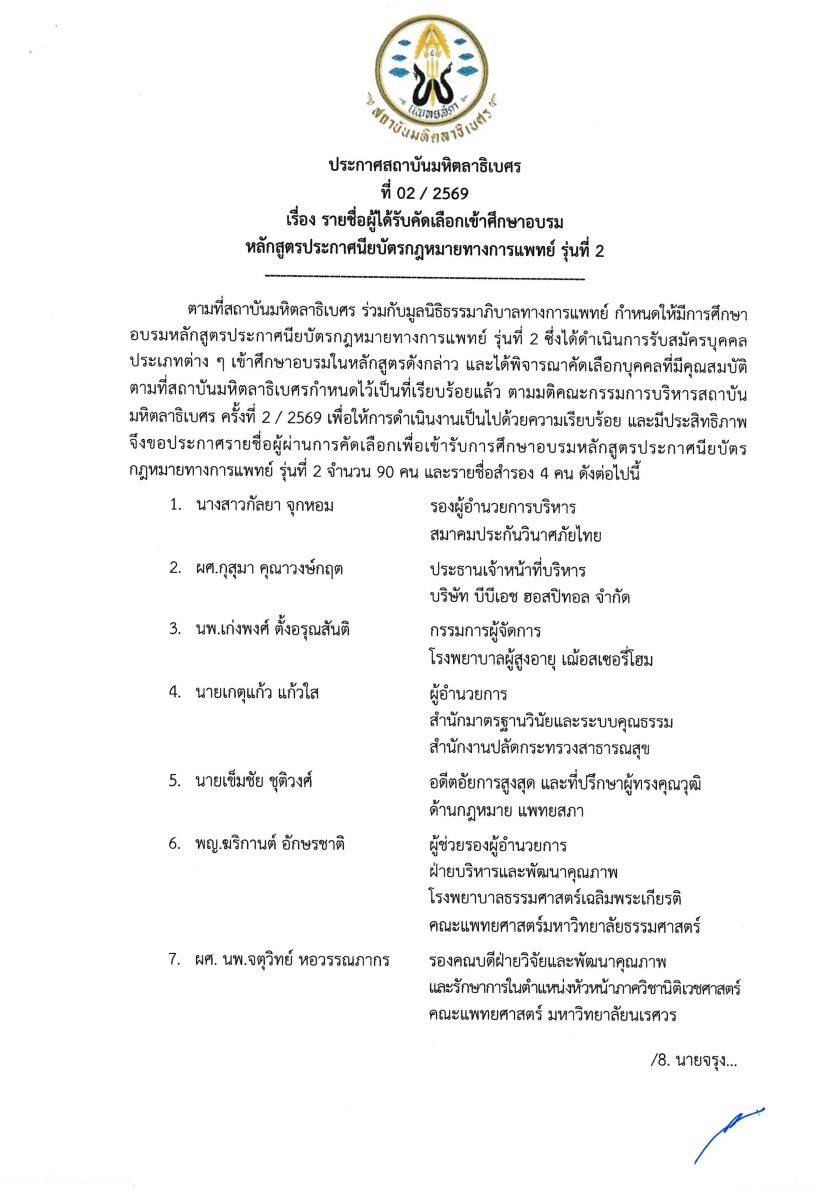 ตามที่สถาบันมหิตลาธิเบศร ร่วมกับมูลนิธิธรรมาภิบาลทางการแพทย์ กำหนดให้มีการศึกษาอบรมหลักสูตรประกาศนียบัตรกฎหมายทางการแพทย์ รุ่นที่ 2 ซึ่งได้ดำเนินการรับสมัครบุคคลประเภทต่าง ๆ เข้าศึกษาอบรมในหลักสูตรดังกล่าว และได้พิจารณาคัดเลือกบุคคลที่มีคุณสมบัติตามที่สถาบันมหิตลาธิเบศรกำหนดไว้เป็นที่เรียบร้อยแล้ว ตามมติคณะกรรมการบริหารสถาบัน มหิตลาธิเบศร ครั้งที่ 2 / 2569 เพื่อให้การดำเนินงานเป็นไปด้วยความเรียบร้อย และมีประสิทธิภาพ จึงขอประกาศรายชื่อผู้ผ่านการคัดเลือกเพื่อเข้ารับการศึกษาอบรมหลักสูตรประกาศนียบัตรกฎหมายทางการแพทย์ รุ่นที่ 2 จำนวน 90 คน และรายชื่อสำรอง 4 คน ดังต่อไปนี้