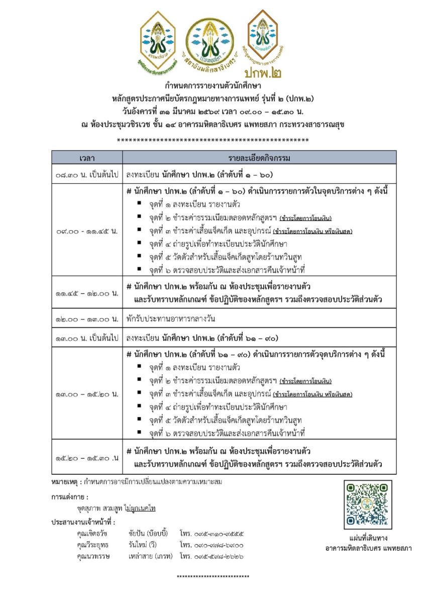 1. ผู้ที่ได้รับการคัดเลือกเข้าศึกษาหลักสูตรประกาศนียบัตรกฎหมายทางการแพทย์ รุ่นที่ 2 (ปกพ.2) รายงานตัวตามลำดับรายชื่อตามกำหนด วัน และเวลา ดังนี้