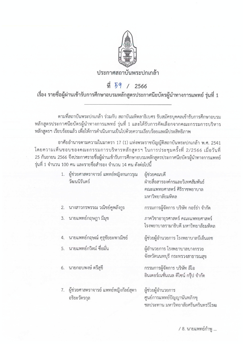 ขอประกาศรายชื่อ #ผู้ผ่านการคัดเลือกเข้าศึกษาอบรมหลักสูตรประกาศนียบัตรผู้นำทางการแพทย์ (ปนพ.) รุ่นที่ 1
